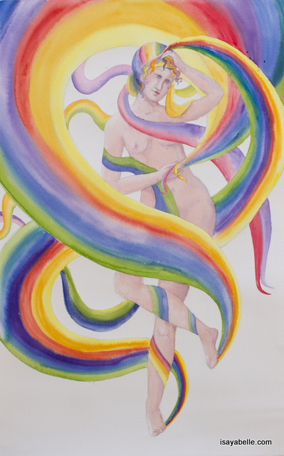 Iris: Goddess of the Rainbow and Messenger for the Gods: she is the representation of the complete woman, who has integrated all the archetypes, and who can now claim to communicate directly with the Goddesses. She has visited each archetype, each colour of the rainbow, and has learnt from them on her path to rising.