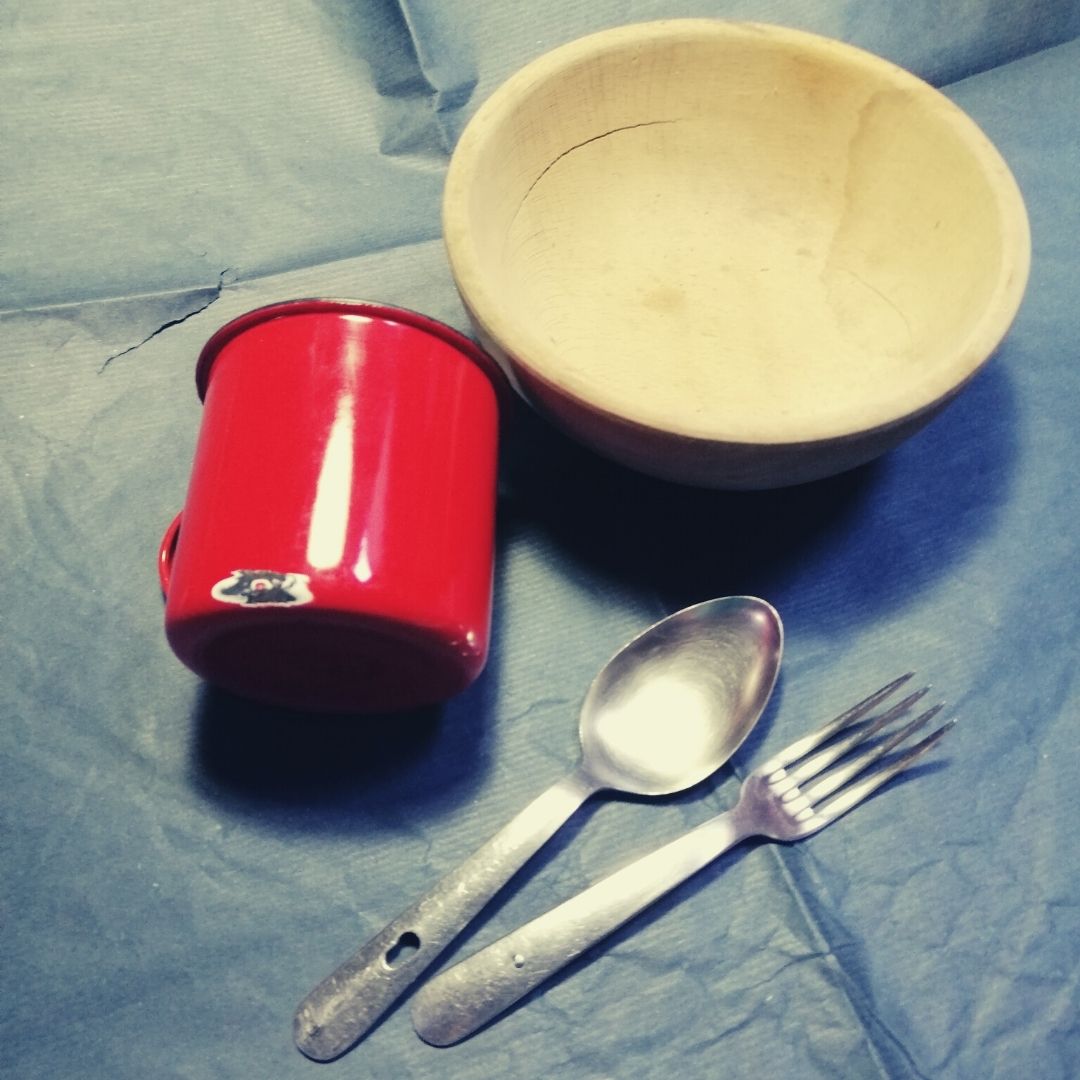 At the time, we were travelling with all of my parents' cutlery and china, which was composed of three wooden bowls, three camping metallic cups, 3 sets of camping spoon and fork and a folding knife each (French Opinel for anyone asking)...I still have my set ... See the picture.